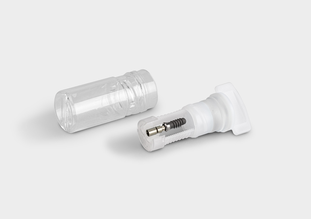 This plastic tube is suitable for dental implants with a diameter of up to 6.5 mm and a length of up to 22 mm. Anti-rolling protection integrated in the closure provides additional safety in sterile operating theaters. DentalImplantPack reliably protects implants against damage and contamination during transportation and storage.