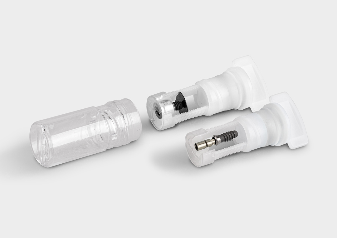 - high-quality individual packaging for dental implants with and without implant mounts
